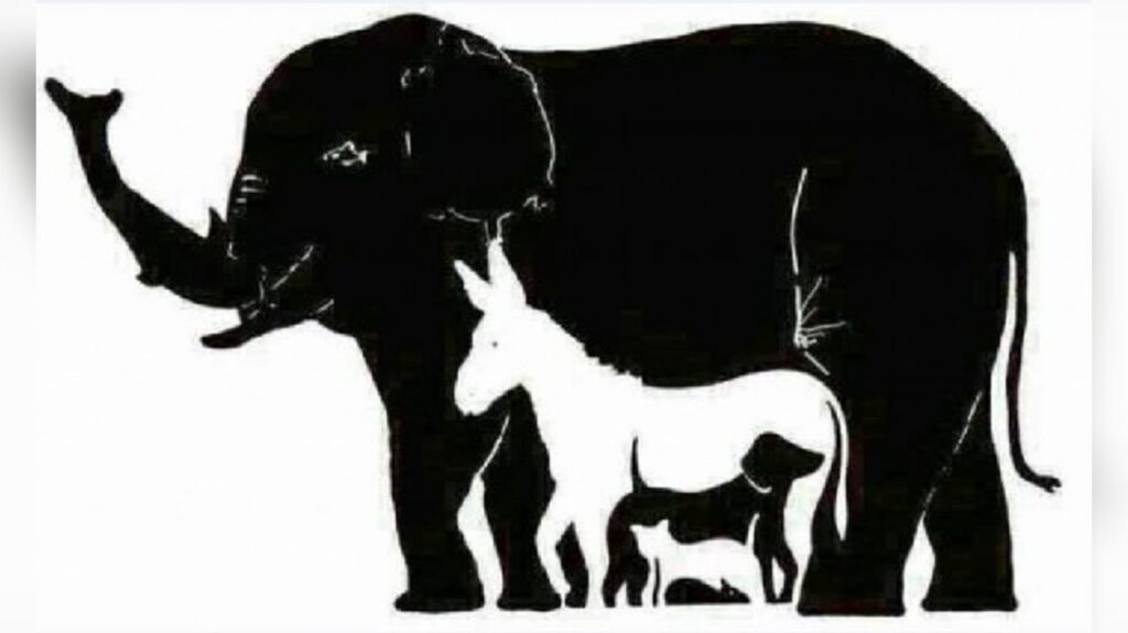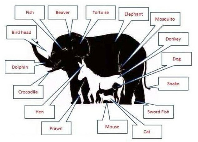 ಮೊದಲ ಈ ಚಿತ್ರವನ್ನು ನೋಡಿದಾಗ ಸ್ವಲ್ಪ ಕ್ಲಿಷ್ಟಕರ ವೆನಿಸಬಹುದು. ಪ್ರಾರಂಭದಲ್ಲಿ ಆನೆಯು ಈ ಚಿತ್ರದಲ್ಲಿ ಸ್ಪಷ್ಟವಾಗಿ ಕಾಣುತ್ತದೆ. ಹಾಗೆಯೇ ಗಮನಹರಿಸಿ ನೋಡುತ್ತಾ ಶೋಧಿಸುತ್ತಾ ಹೋದಂತೆ ಒಂದೊಂದು ಪ್ರಾಣಿಗಳು ಕಾಣಿಸಲು ಶುರುವಾಗುತ್ತದೆ. ಈ ಚಿತ್ರದಲ್ಲಿ ಕತ್ತೆ, ಹಾವು, ಬೆಕ್ಕು, ಆಮೆ, ಹೀಗೆ ಕೆಲವು ಹೆಸರುಗಳನ್ನು ನಿಮಗೆ ಕ್ಲೂ ಸ್ವರೂಪದಲ್ಲಿ ಹೇಳುತ್ತೇವೆ. ಉಳಿದವುಗಳಿಗಾಗಿ ನೀವು ಪ್ರಯತ್ನಿಸಿ, ಆ ಎಲ್ಲ 16 ಪ್ರಾಣಿಗಳು ಯಾವವು ಎಂಬುವುದನ್ನು ಕಮೆಂಟ್ ಮಾಡಿ ಹೇಳಿರಿ.