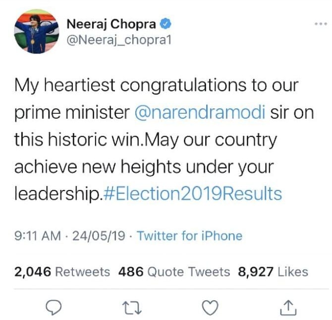 ಪ್ರಧಾನ ಮಂತ್ರಿ ಮೋದಿಯವರ ನೇತೃತ್ವದಲ್ಲಿ 2019 ರ ಮೇ ತಿಂಗಳಿನಲ್ಲಿ ಎರಡನೆಯ ಬಾರಿಗೆ ಲೋಕಸಭೆಯ ಎಲೆಕ್ಷನ್ ಗೆದ್ದ ನಂತರ ಇದೇ ಸಂದರ್ಭ ವಾಗಿ ಮೇ 24 ರಂದು ನೀರಜ್ ಒಂದು ಟ್ವೀಟ್ ಮಾಡಿದ್ದರು. ತಮ್ಮ ಟ್ವೀಟ್ ನಲ್ಲಿ ನೀರಜ್ ಅವರು, ‘ಈ ಐತಿಹಾಸಿಕ ಗೆಲುವಿಗಾಗಿ ಪ್ರಧಾನಮಂತ್ರಿ ನರೇಂದ್ರ ಮೋದಿ ಅವರೇ ನಿಮಗೆ ಅಭಿನಂದನೆಗಳು. ನಿಮ್ಮ ನೇತೃತ್ವದಲ್ಲಿ ದೇಶವು ಹೊಸ ಶಿಖರಕ್ಕೆ ಮುಟ್ಟಲಿ ಎಂದು ಇಚ್ಚಿಸುತ್ತೇನೆ’ ಅಂತ ಹೇಳಿದ್ದರು.