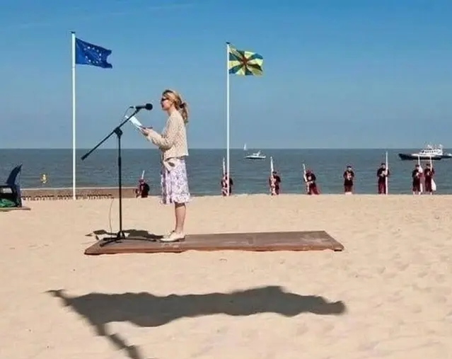 ಮಹಿಳೆ ನೆಲದ ಮೇಲೆನೆ ನಿಂತಿದ್ದಾಳೆ, ಧ್ವಜದ ಛಾಯೆ ಬಿದ್ದಿದೆ.