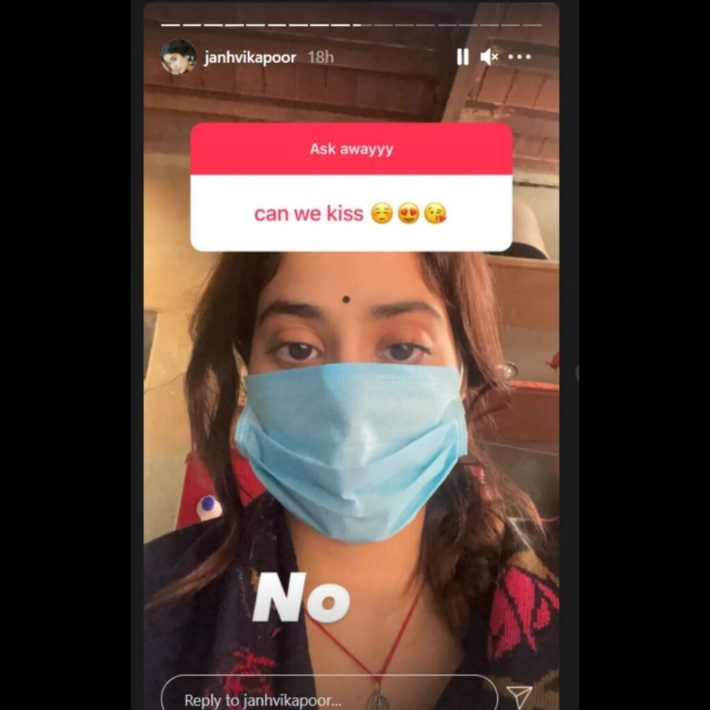 ಈ ಬಾರಿ ಜಾಹ್ನವಿ ಕಪೂರ್ ಅವರು ಇನ್ಸ್ಟಾಗ್ರಾಮ್ ನಲ್ಲಿ ‘ಆಸ್ಕ್ ಮೀ ಎನಿಥಿಂಗ್’ ಸೇಶನ್ ನಲ್ಲಿ ಅಭಿಮಾನಿಗಳು ಜಾಹ್ನವಿ ಅವರಿಗೆ ಅನೇಕ ಪ್ರಶ್ನೆಗಳನ್ನು ಕೇಳಿದರು. ಅನೇಕ ಅಭಿಮಾನಿಗಳು ಅವರನ್ನು ಅಷ್ಟೇ ಹೊಗಳಿದರೂ ಸಹ. ಇದೇ ಸಂದರ್ಭದಲ್ಲಿ ಒಬ್ಬ ಅಭಿಮಾನಿಯ ಪ್ರಶ್ನೆಗೆ ಜಾಹ್ನವಿ ಕಪೂರ್ ಅವರು ನೀಡಿದ ಉತ್ತರ ತುಂಬಾ ಚರ್ಚೆಗೆ ಈಡಾಗಿದೆ. ಈ ಸಂದರ್ಭದಲ್ಲಿ ಅಭಿಮಾನಿಯೊಬ್ಬನು ಜಾಹ್ನವಿ ಕಪೂರ್ ಅವರಿಗೆ ಕಿಸ್ ಕೊಡುವ ಇಚ್ಛೆ ವ್ಯಕ್ತ ಮಾಡಿದ್ದಾನೆ. ಈ ಪ್ರಶ್ನೆಗೆ ಉತ್ತರವಾಗಿ ಜಾಹ್ನವಿ ಕಪೂರ್ ಅವರು ಮಾಸ್ಕ್ ಧರಿಸಿದ ತಮ್ಮದೇ ಆದ ಒಂದು ಫೋಟೋ ಶೇರ್ ಮಾಡಿ ಅದಕ್ಕೆ ನೋ ಎಂದು ಕ್ಯಾಪ್ಷನ್ ನೀಡಿದ್ದಾರೆ.