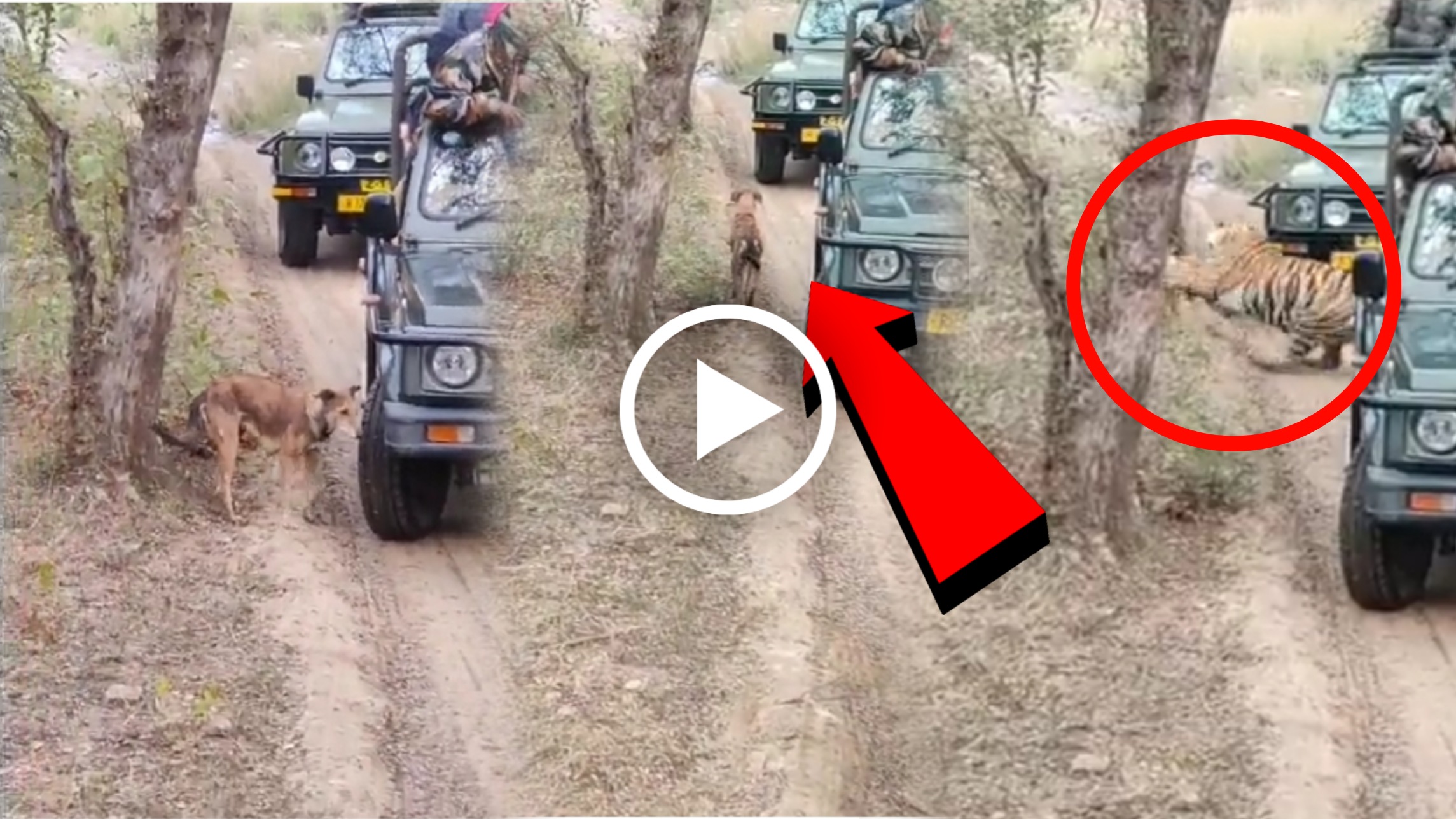 ಈ ವಿಡಿಯೋದಲ್ಲಿ ಜಂಗಲ್ ಸಫಾರಿ ಸಲುವಾಗಿ ಪ್ರವಾಸಿಗರು ತಿರುಗಾಡುವಾಗ ಹುಲಿಯನ್ನು ವೀಕ್ಷಿಸಲು ಎಲ್ಲರೂ ಒಂದು ಕಡೆ ನಿಂತಿದ್ದಾರೆ. ಆದರೆ ಇವರಿಗೆ ತಾವು ಸುತ್ತಾಡುತ್ತಿರುವ ವಾಹನದ ಹಿಂದೆಯೇ ಹುಲಿಯೊಂದು ನಾಯಿಯ ಬೇಟೆಗಾಗಿ ಅವಿತು ಕುಳಿತಿದೆ ಎಂಬುದು ಗೊತ್ತೇ ಇಲ್ಲ.
