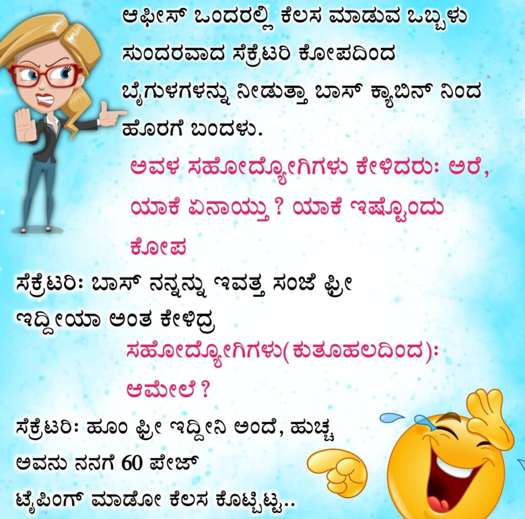 ಫನ್ನಿ ಜೋಕ್ಸ್ : ಒಬ್ಬಳು ಸುಂದರ ಸೆಕ್ರೆಟರಿ ಬಾಸ್ ಆಫೀಸಿನಿಂದ ಸಿಟ್ಟಿನಿಂದ ಹೊರಗೆ ಬಂದಳು, ಸಹೋದ್ಯೋಗಿಗಳು ಕೇಳಿದರು- ಯಾಕೆ ಏನಾಯಿತು? ಸೆಕ್ರೆಟರಿ ಸಿಟ್ಟಿನಿಂದ – ಬಾಸ್ ನನ್ನನ್ನು ಇವತ್ತು ಸಂಜೆ…
