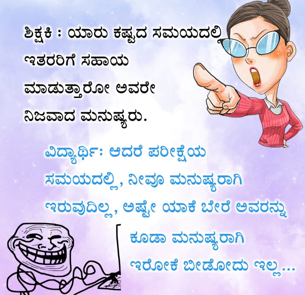 ಶಿಕ್ಷಕಿ : ಯಾರು ಕಷ್ಟದ ಸಮಯದಲ್ಲಿ ಇತರರಿಗೆ ಸಹಾಯ ಮಾಡುತ್ತಾರೋ ಅವರೇ ನಿಜವಾದ ಮನುಷ್ಯರು.