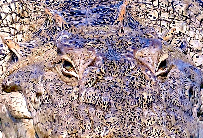 this is a cropped photo of a crocodile- Head parts near both eyes.