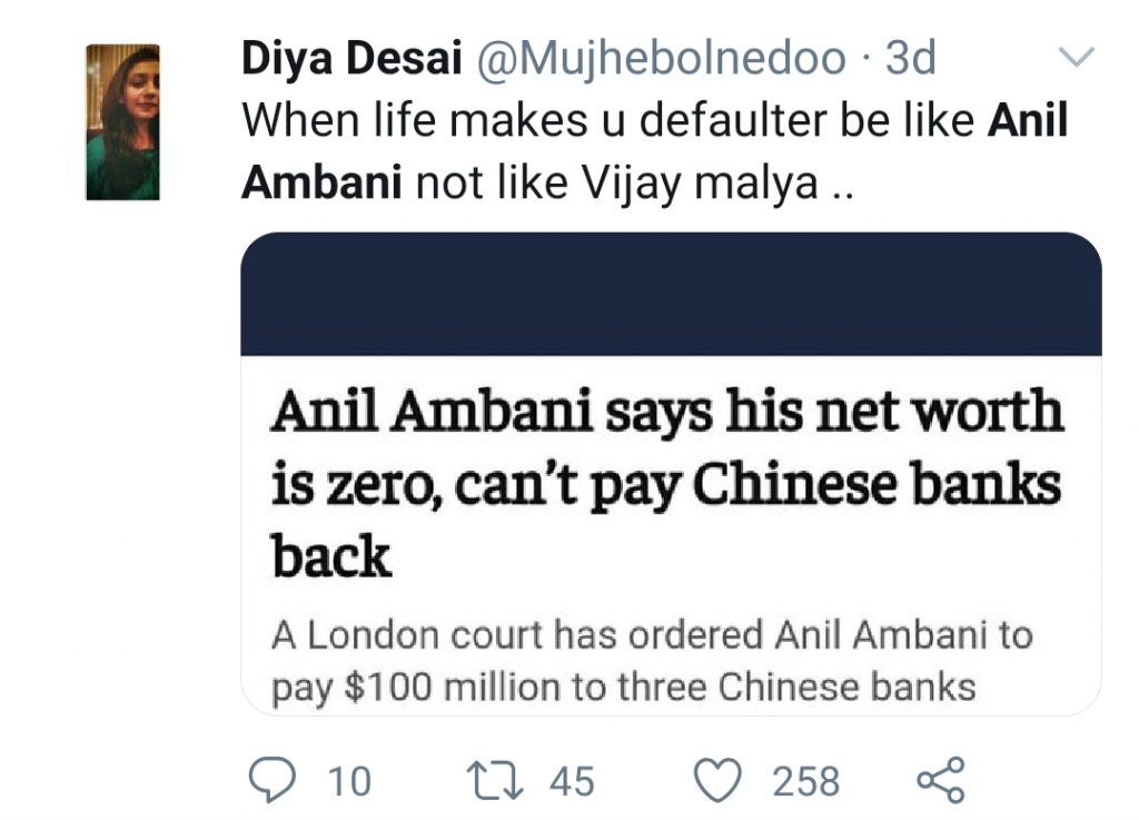 ಒಬ್ಬ ಯೂಜರ್ ಅಂತೂ ಒಂದು ವೇಳೆ ಡಿಫಾಲ್ಟರ್ ಅಗಬೇಕೆನಿಸಿದರೆ ಅನಿಲ್ ಅಂಬಾನಿ ತರ ಆಗಿ, ವಿಜಯ್ ಮಲ್ಯ ತರ ಆಗಬೇಡಿ. ಇದರ ಜೊತೆಗೆ ಆತ ಆ ಸುದ್ದಿಯನ್ನು ಸಹಿತ ಶೇರ್ ಮಾಡಿದ್ದಾನೆ. ಅದರಲ್ಲಿ ಅನಿಲ್ ಹೇಳುತ್ತಾರೆ ನಾನಂತೂ ಈಗ ದರಿದ್ರನಾಗಿದ್ದೇನೆ.