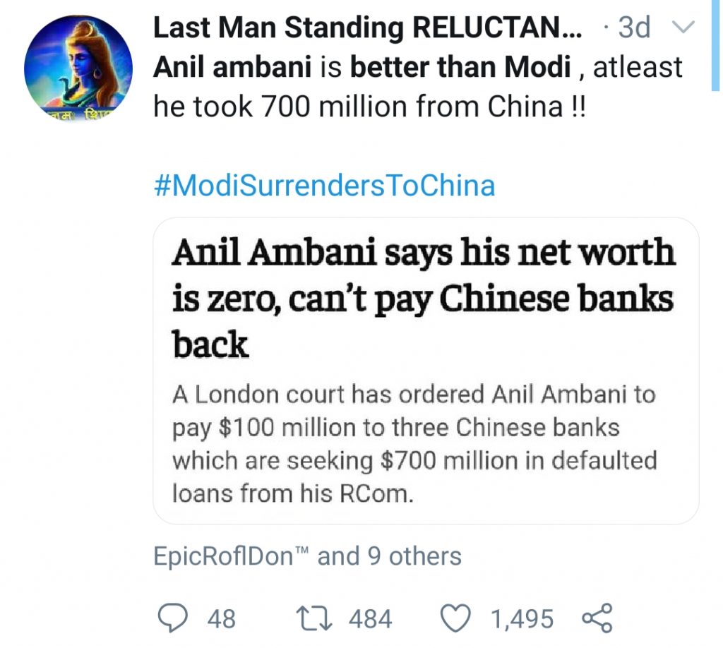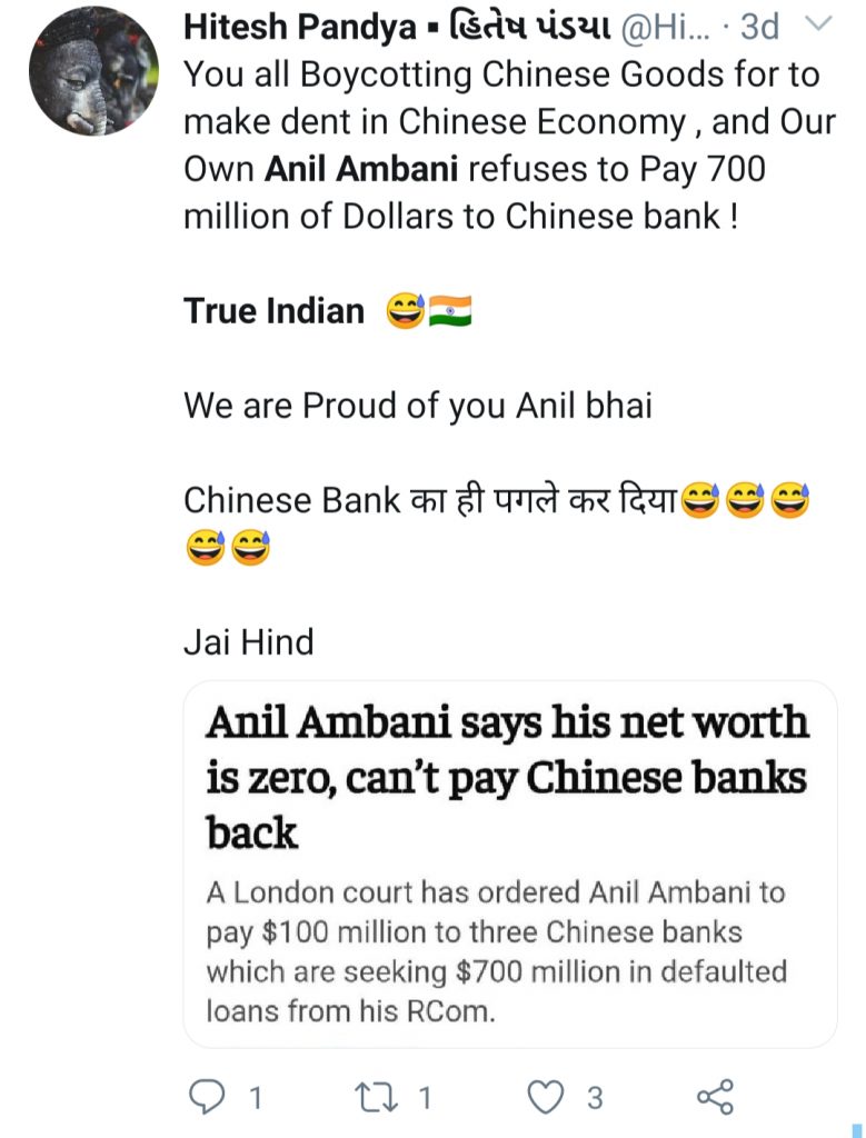 ಒಬ್ಬ ಟ್ವಿಟ್ಟರ್ ಯೂಜರ್ ಸಂಪೂರ್ಣ ದೇಶದಲ್ಲಿ #BoycottChina ಅಭಿಯಾನ ನಡೆಸಲಾಗುತ್ತಿದೆ. ಚಾಯನೀಜ್ ವಸ್ತುಗಳನ್ನು ಖರೀದಿಸಬೇಡಿ ಎಂದು ಅಪೀಲ್ ಮಾಡಲಾಗುತ್ತಿದೆ. ಹೀಗಾಗಿ ಚೀನಾವನ್ನು ಆರ್ಥಿಕ ಮುಗ್ಗಟ್ಟಿಗೆ ಸಿಲುಕಿಸಲು ಸಹಾಯವಾಗುತ್ತಿದೆ. ಇಷ್ಟೆಲ್ಲ ಮಾಡುತ್ತಿರುವಾಗ ನಮ್ಮ ಅನಿಲ್ ಅಂಬಾನಿಯವರು ಚೀನಾದ ಬ್ಯಾಂಕುಗಳಿಗೆ ಸುಮಾರು 700 ಮಿಲಿಯನ್ ಡಾಲರ್ (ಸುಮಾರು 500 ಕೋಟಿ ₹) ಕೊಡಲು ನಿರಾಕರಿಸಿದ್ದಾರೆ. ನಿಜವಾದ ಇಂಡಿಯನ್ ಅಂದ್ರೆ ನೀವಿದ್ದೀರಿ ಸರ್, ನಮಗೆ ನಿಮ್ಮ ಮೇಲೆ ಗರ್ವ ಇದೆ.