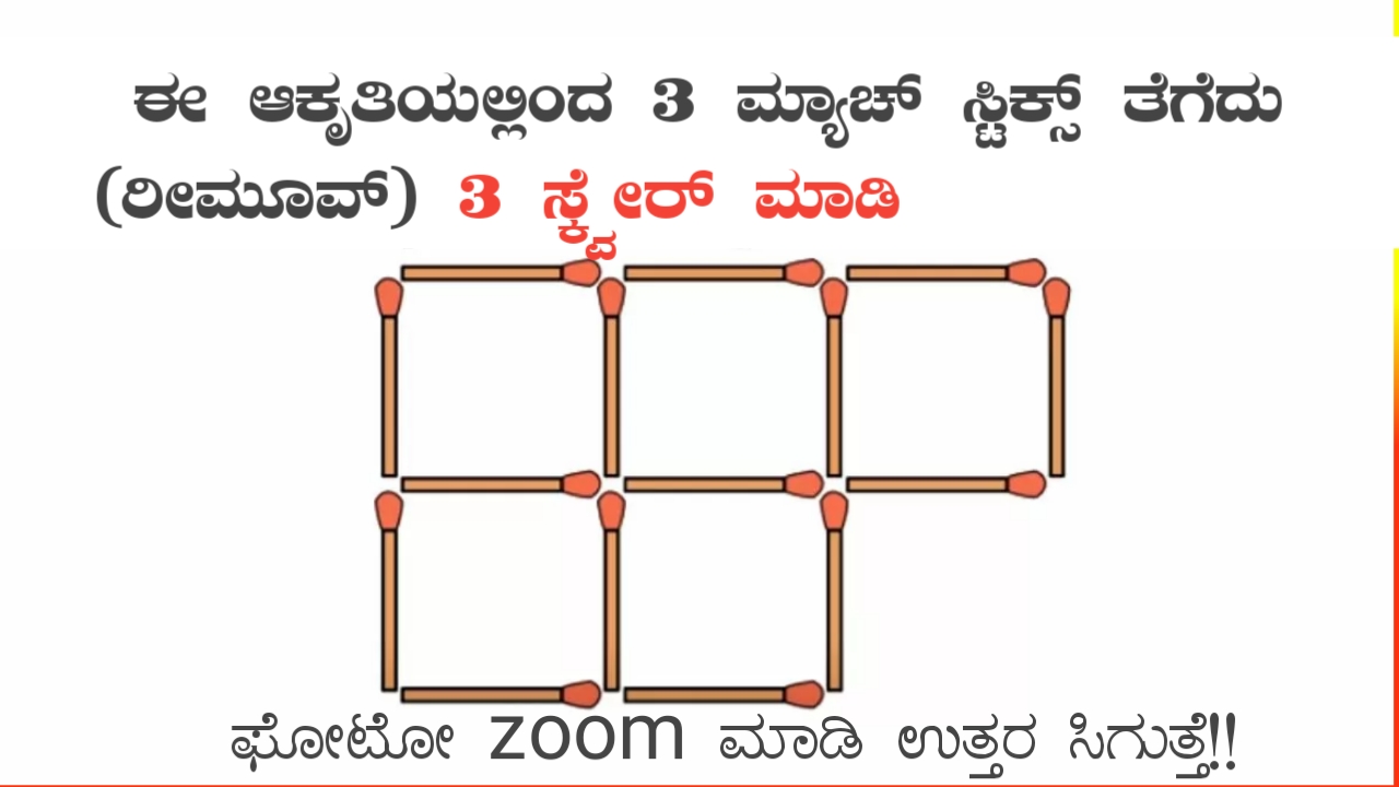 ಮೇಲಿನ ಈ ಚಿತ್ರದಲ್ಲಿ ದೀಪದ ಕಡ್ಡಿಗಳ ಮುಖಾಂತರ ತಯಾರಿಸಿದ ಒಟ್ಟು ಏಳು ಸ್ಕ್ವೇರ್ ಗಳು ಕಂಡುಬರುತ್ತಿವೆ. ನಿಮಗೆ ಈ ಚಿತ್ರದಲ್ಲಿ ಯಾವುದೇ ರೀತಿ ಬೇರೆ ಹಸ್ತಕ್ಷೇಪ ಮಾಡದೆ ಈ ಚಿತ್ರದಲ್ಲಿಂದ ಬರಿ ಮೂರೇ ಮೂರು ದೀಪದ ಕಡ್ಡಿಗಳನ್ನು ತೆಗೆದು ಹಾಕಬೇಕು. ಹಾಗೂ ಅಲ್ಲಿ 3 ಸ್ಕ್ವೇರ್ ಗಳು ಕಂಡು ಬರುವಂತೆ ನಿಮಗೆ ಮಾಡಬೇಕಿದೆ. ಈ ಕೆಲಸವನ್ನು ನೀವು ನಿಮ್ಮ ಮೇಲೆ ವಿಶ್ವಾಸವಿಟ್ಟು ಪ್ರಾಮಾಣಿಕತನದಿಂದ ಬರೀ 20 ಸೆಕೆಂಡ್ಗಳಲ್ಲಿ ಈ ಪಜಲ್ ಬಿಡಿಸಿ ತೋರಿಸಬೇಕು. ಈ ಒಗಟನ್ನು ಬಿಡಿಸುವಾಗ ನೀವು ಸ್ಕ್ರೋಲ್ ಮಾಡುತ್ತಾ ಕೆಳಗೆ ಹೋಗಬೇಡಿ. ಕಾರಣ ಇದರ ಉತ್ತರವನ್ನು ಕೆಳಗೆ ನೀಡಿದ್ದೇವೆ.