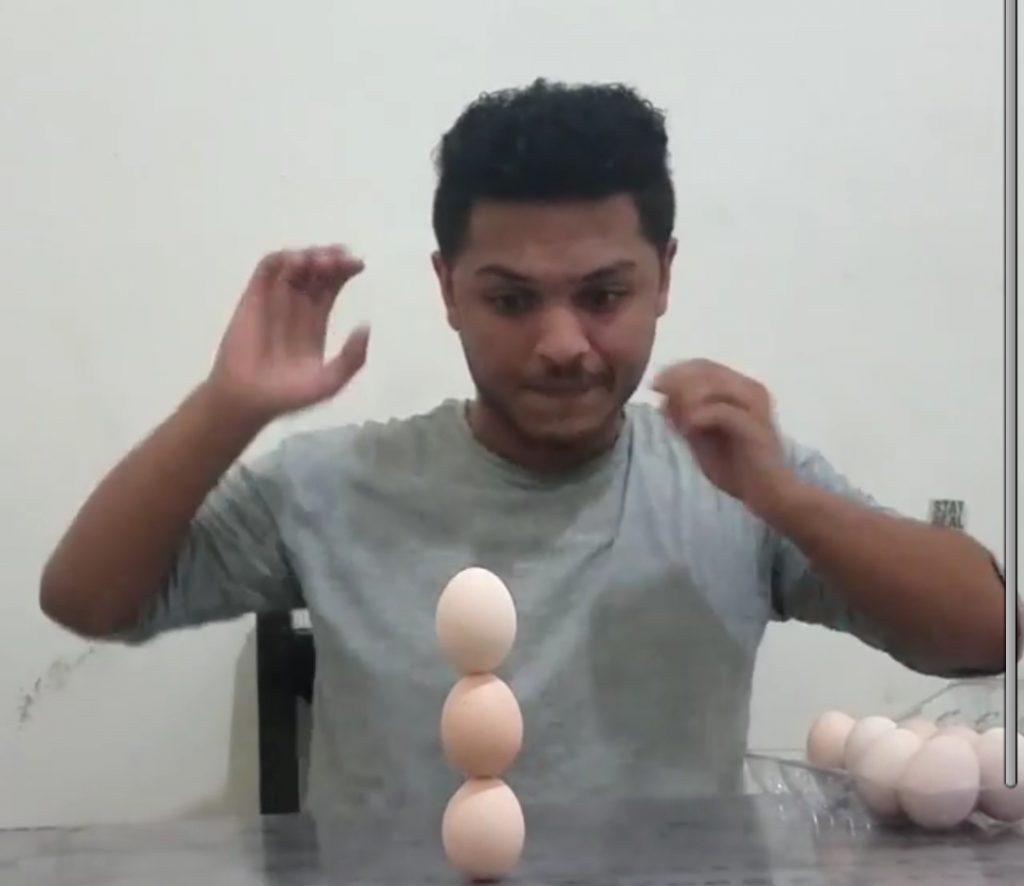 Mohammed Abelhameed Muqbel ನು ಇದೇ ವರ್ಷ ಏಪ್ರಿಲ್ 10 ರಂದು ಮೂರು ಮೊಟ್ಟೆಗಳನ್ನು ಒಂದರ ಮೇಲೊಂದು ಇಟ್ಟು ಗಿನ್ನೆಸ್ ವರ್ಲ್ಡ್ ರೆಕಾರ್ಡ್ ನಲ್ಲಿ ತಮ್ಮ ಹೆಸರನ್ನು ಜೋಡಿಸಿದರು. ಈತ ಮೊಟ್ಟೆಯ ಸೆಂಟರ್ ಆಫ್ ಮಾಸ್ ಗುರುತಿಸಿ ಅದರ ಸಹಾಯದಿಂದ ಈ ಅಸಾಧ್ಯವಾದ ಟಾವರ್ ನ್ನು ನಿರ್ಮಿಸುತ್ತಾರೆ. ಇದು ಯಾವುದೇ ಸಾಮನ್ಯ ವ್ಯಕ್ತಿಗೆ ಸಾಧ್ಯವಾಗುವದಿಲ್ಲ. ಇದರಲ್ಲಿ ನಿಪುಣತೆ ಹೊಂದಲು ಪ್ರ್ಯಾಕ್ಟೀಸ್, ಏಕಾಗ್ರತೆ ಮತ್ತು ಸಂಯಮದ ಅವಶ್ಯಕತೆ ಇರುತ್ತದೆ.