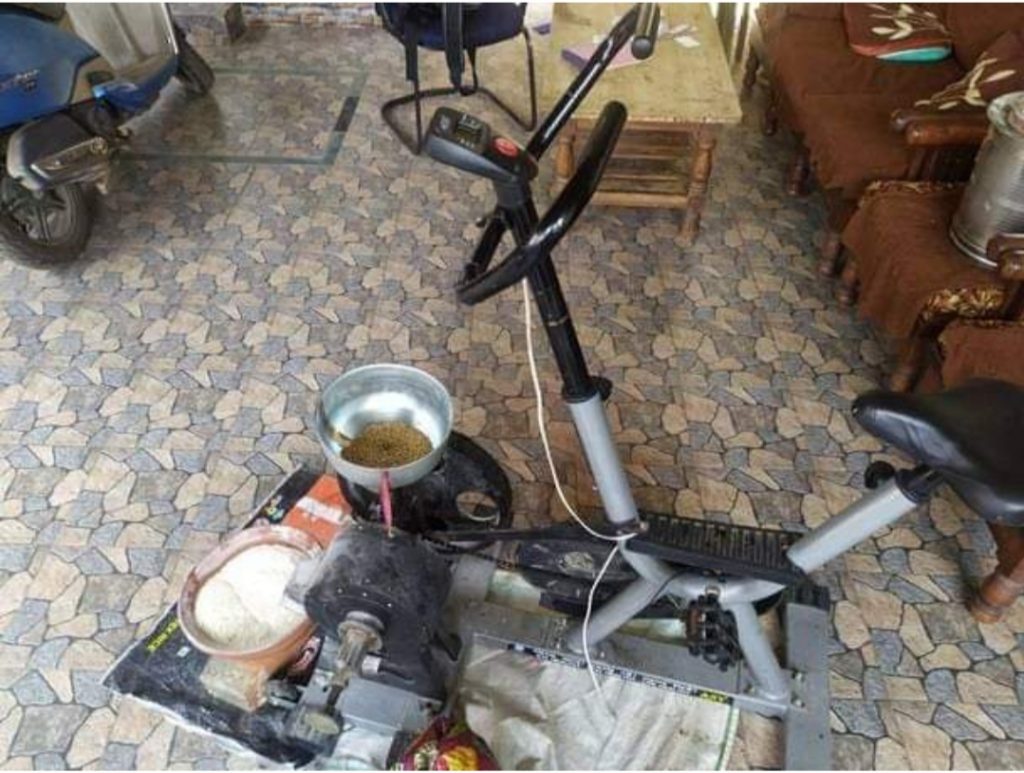 ಲಾಕ್ ಡೌನ್ ದಲ್ಲಿ ಸೈಕಲ್ ನಿಂದ ತಯಾರಿಸಿದ ಹಿಟ್ಟಿನ ಗಿರಣಿ, ವ್ಯಾಯಾಮದ ಜೊತೆಗೆ ಹೀಟ್ಟೂ ಸಹ ರುಬ್ಬುವರು.