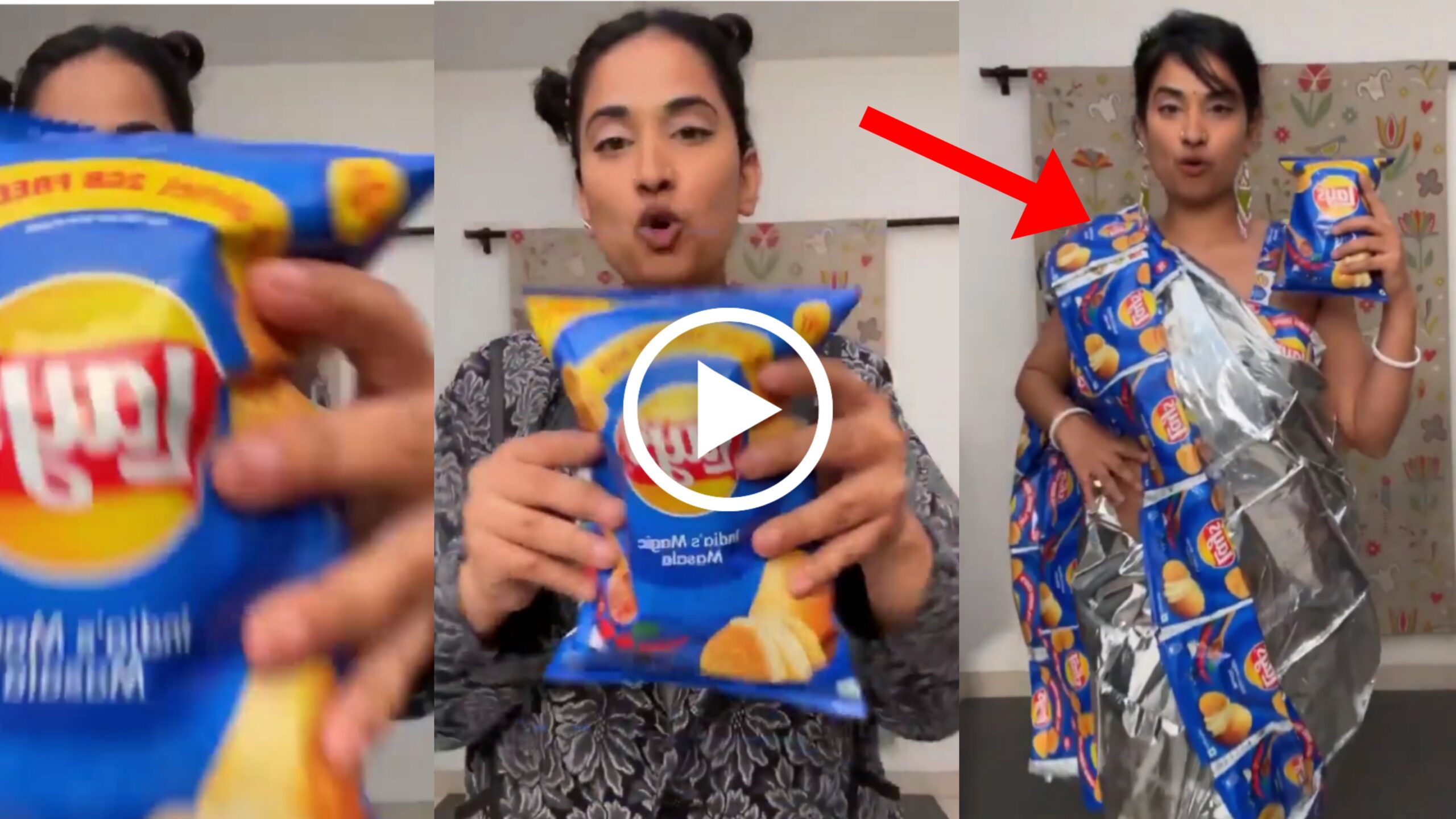 ವೈರಲ್ ಆದ ಈ ವಿಡಿಯೋದಲ್ಲಿ ಮಹಿಳೆಯು ಚಿಪ್ಸ್ ಪ್ಯಾಕೆಟ್ ಅಥವಾ ರ್ಯಾಪರ್ ನಿಂದ ತಯಾರಿಸಿದ ಸೀರೆಯನ್ನು ತೊಟ್ಟಿದ್ದಾಳೆ. ಹೌದು ಇದು ನೂರಕ್ಕೆ 100 ರಷ್ಟು ಸತ್ಯ. ಹಾಗೆಯೇ ಕೈಯಲ್ಲಿ ಒಂದು ಚಿಪ್ಸ್ ಪ್ಯಾಕೆಟ್ ಸಹ ಹಿಡಿದಿದ್ದಾಳೆ. ವಿಡಿಯೋ ನೋಡಿದ ನೆಟ್ಟಿಗರು ಆಶ್ಚರ್ಯವಾಗಿದ್ದಾರೆ. ಮತ್ತು ತಮ್ಮ ವಿವಿಧ ಪ್ರತಿಕ್ರಿಯೆಗಳನ್ನು ನೊಂದಾಯಿಸುತ್ತಿದ್ದಾರೆ.