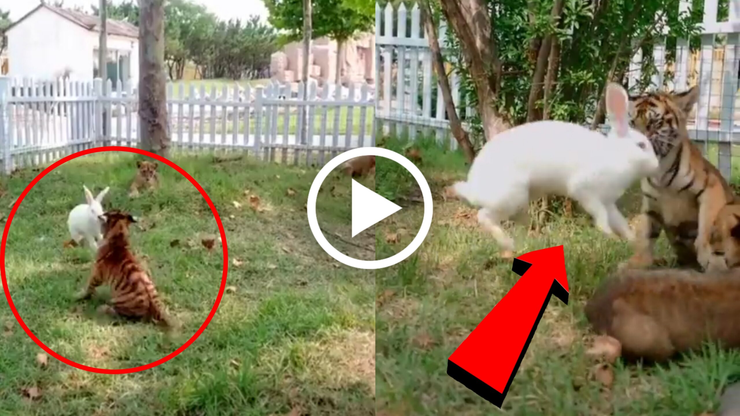 ಈ ವಿಡಿಯೋದಲ್ಲಿ ಒಂದು ಕೈತೋಟ ಕಂಡು ಬರುತ್ತಿದೆ. ಅಲ್ಲಿ ಹುಲಿರಾಯನ ಪುಟ್ಟ ಪುಟ್ಟ ಮರಿಗಳ ಜೊತೆಗೆ ಒಂದು ಸುಂದರವಾದ ಹಾಲು ಬಣ್ಣದ ಮುದ್ದು ಮೊಲ ಇದೆ. ಈ ಮೊಲ ಪುಟ್ಟ ಹುಲಿಗಳ ಮೇಲೆ ಜಿಗಿಜಿಗಿದು ಸತತವಾಗಿ ಅಟ್ಯಾಕ್ ಮಾಡುತ್ತಿದೆ. ಇದರಿಂದ ಹುಲಿಮರಿಗಳು ನಿಜಕ್ಕೂ ಬೇಸತ್ತಿವೆ. ನಂತರ ಇದರ ತಾಪತ್ರಯಕ್ಕೆ ಅಲ್ಲಿಂದ ಒಡಿ ಹೋಗುವುದೇ ಸರಿ ಎಂದು ಕಾಲ್ಕಿತ್ತಿವೆ. ಇಲ್ಲಿ ಮೊಲ ಹುಲಿ ಮರಿಗಳ ಮೇಲೆ ಸಖತ್ ದರ್ಬಾರು ನಡೆಸುತ್ತಿರುವದು ಕಂಡು ಬರುತ್ತಿದೆ.