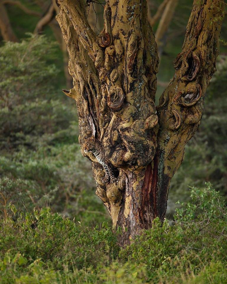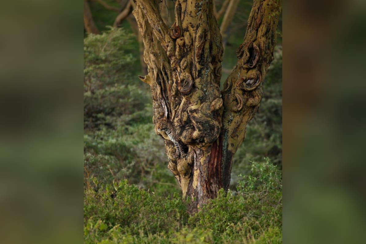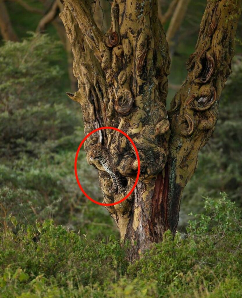 ಚಿತ್ರದಲ್ಲಿ ಒಂದು ಸುಂದರವಾದ ಮರವಿದೆ. ಅಲ್ಲಿ ಬರೀ ಮರವಷ್ಟೇ ಅಲ್ಲ, ಆ ಮರದ ಪೊಟರೆಯಲ್ಲಿ ಚಿರತೆಯೊಂದು ಹೊರಗೆ ನೋಡುತ್ತಿರುವ ದೃಶ್ಯವಿದೆ. ನೋಡುಗರಲ್ಲಿ ಕೆಲವರಿಗೆ ಇದು ನಿಜವಾದ ಚಿರತೆ ಇಲ್ಲ ಎಂಬ ಭ್ರಮೆ ಕಾಡಿದೆ. ಮರದಲ್ಲಿ ನೈಸರ್ಗಿಕವಾಗಿಯೇ ಮರದ ಕಾಂಡದಲ್ಲಿ ಚಿರತೆ ನಿಂತ ಹಾಗೆ ಕಲಾಕೃತಿ ನಿರ್ಮಾಣವಾಗಿದೆ ಎನ್ನುತ್ತಿದ್ದಾರೆ. ಏನೇ ಆಗಲಿ ಮರದ ಪೊಟರೆಯಲ್ಲಿ ಮಾತ್ರ ಚಿರತೆ ಇದ್ದದ್ದು ನಿಜ. ಹಾಗೂ ಅದನ್ನು ಸರಿಯಾಗಿ ತೀಕ್ಷ್ಣವಾದ ದೃಷ್ಟಿಯಿಂದ ನೋಡಿದಾಗಲೇ ಕಾಣಿಸುವದು.