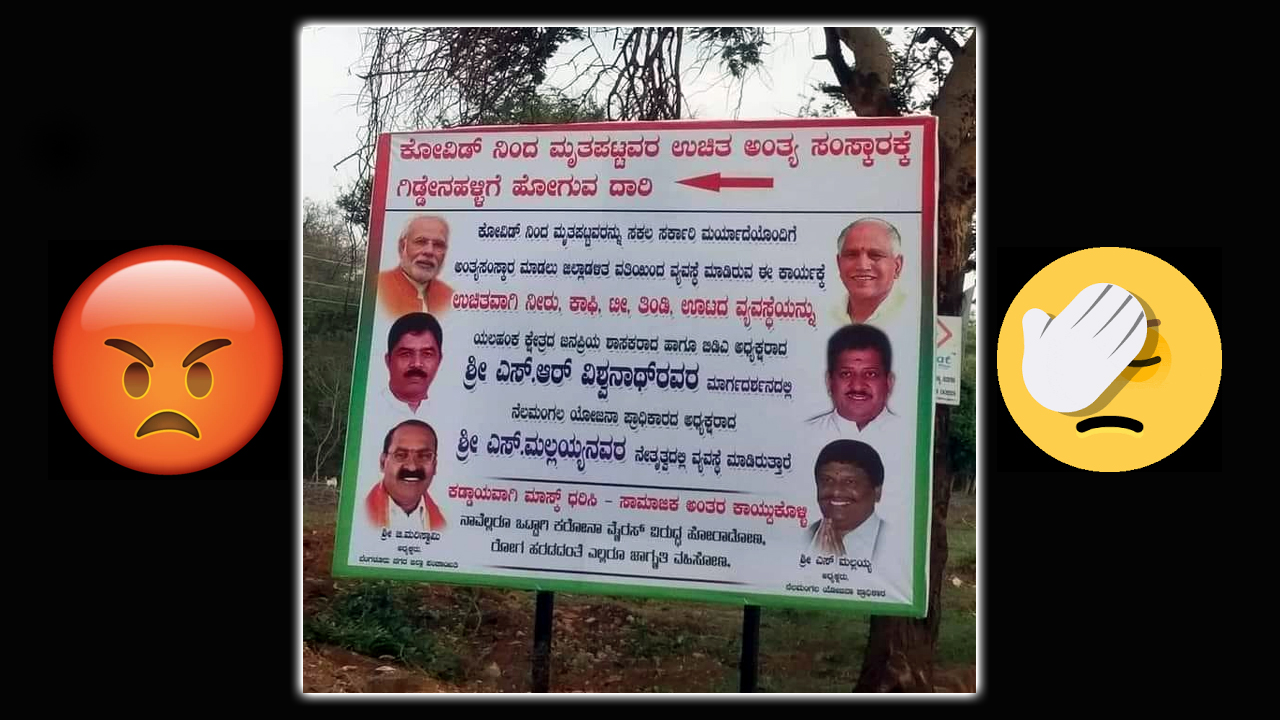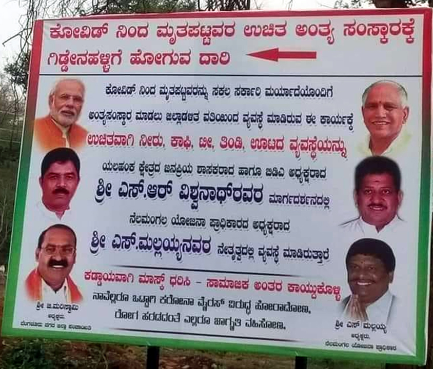 ಕೋವಿಡ್ ನಿಂದ ಮೃತಪಟ್ಟವರ ಅಂತ್ಯಸಂಸ್ಕಾರಕ್ಕೆ ದಾರಿ ಅಂತ ಹಾಕಿರೊ ಬೋರ್ಡಲ್ಲಿ ನಗುತ್ತಿರುವ ನಾಯಕರ ಫೋಟೊ : ನೆಟ್ಟಿಗರ ಆಕ್ರೋಶ