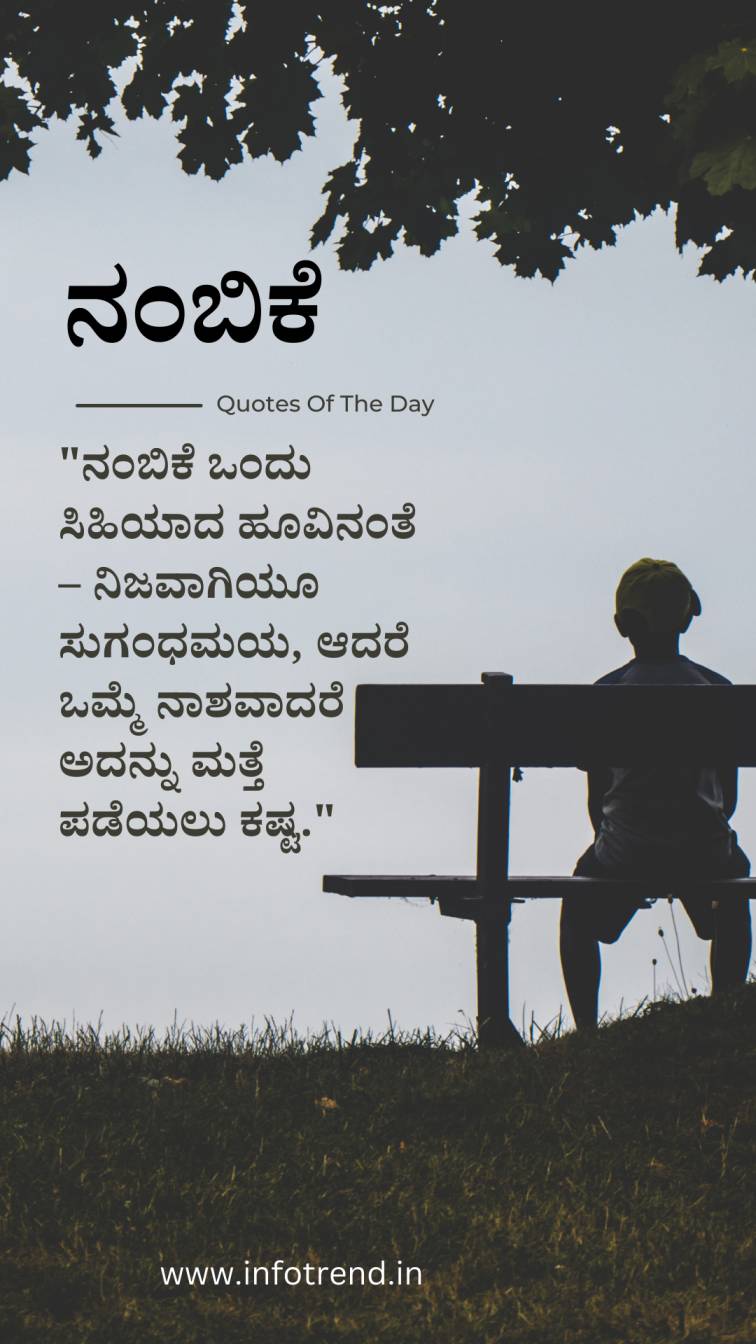 ನಂಬಿಕೆ ನಮ್ಮ ಜೀವನದ ಬಹುಮುಖ್ಯ ಅಂಶವಾಗಿದೆ. ಇದು ಸಂಬಂಧಗಳನ್ನು ಬಲಪಡಿಸುವ ಶಕ್ತಿ ಹೊಂದಿದ್ದು, ಮಾನವೀಯತೆಯ ನವಿರಾದ ಸಂಬಂಧಗಳನ್ನು ನಿರ್ಮಿಸುತ್ತದೆ. ನಂಬಿಕೆಯು ಬಾಂಧವ್ಯ, ಸ್ನೇಹ, ಪ್ರೀತಿ, ಮತ್ತು ನಿಷ್ಠೆಯ ನೆಲೆಯಲ್ಲಿ ಬೆಳೆದೊಡೆಯುತ್ತದೆ. ಇಲ್ಲಿ ನಂಬಿಕೆ ಕುರಿತು ಕೆಲವು ಕನ್ನಡ ಉಲ್ಲೇಖಗಳನ್ನು ನೀಡಲಾಗಿದೆ ಮತ್ತು ಅವುಗಳ ವಿವರಣೆ: