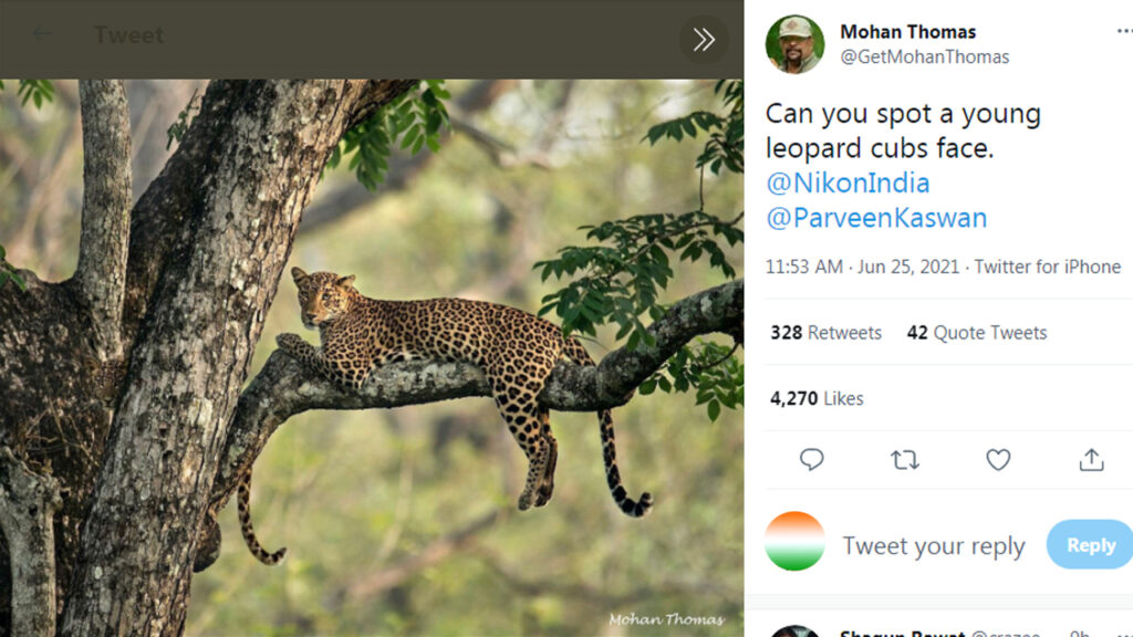 ಇನ್ನು ಈ ಫೋಟೋ ಜೊತೆಗೆ ಅವರು ಕ್ಯಾಪ್ಷನ್ ನಲ್ಲಿ ನೀವು ಇದರಲ್ಲಿ ಯಂಗ್ ಲೆಪರ್ಡ್ ನ ಮುಖವನ್ನು ಹುಡುಕಬಲ್ಲಿರಾ?? ಹಾಗಾದರೆ ನೋಡಿ, ಇದರಲ್ಲಿ ನೋಡಿದಾಗ ನಮಗೆ ಒಂದೇ ಚಿರತೆ ಕಾಣುತ್ತದೆ. ಚಿತ್ರದಲ್ಲಿ ಮರದ ಕೊಂಬೆಯ ಮೇಲೆ ಕುಳಿತ ಚಿರತೆ ಬಹಳ ಸ್ಪಷ್ಟವಾಗಿ ನಮಗೆ ಕಾಣುತ್ತದೆ.