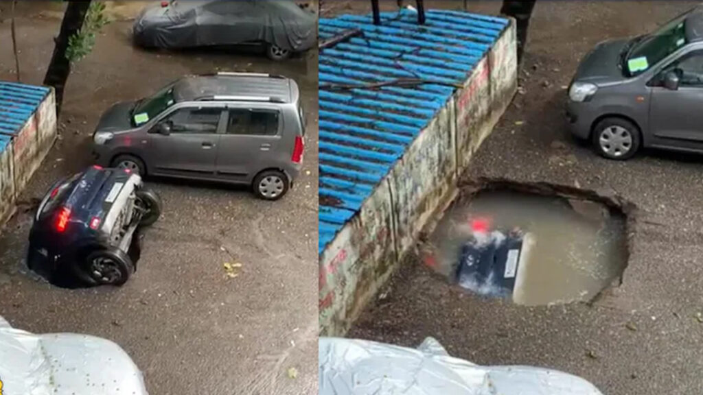 ಭಾನುವಾರ, ಮುಂಬೈನ ವಸತಿ ಪ್ರದೇಶದಲ್ಲಿ ವಾಹನ ನಿಲುಗಡೆ ಸ್ಥಳದಲ್ಲಿ ನಿಲ್ಲಿಸಿದ್ದ ಕಾರು ಕಾಂಕ್ರೀಟ್ ಬೇಸ್ ನಲ್ಲಿನ ಗುಂಡಿಯಲ್ಲಿ ಏಕಾಏಕಿ ಮುಳುಗಿ ಹೋಯಿತು, ಆ ವಿಡಿಯೋ ಭಾನುವಾರ ಸಾಮಾಜಿಕ ಮಾಧ್ಯಮದಲ್ಲಿ ವೈರಲ್ ಆಗಿದೆ. ಈ ಘಟನೆ ಘಾಟ್ಕೋಪರ್ ಪಶ್ಚಿಮ ಪ್ರದೇಶದದ್ದು.