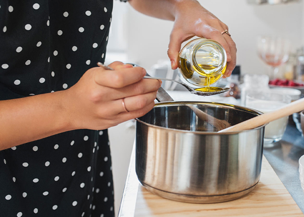 2) ಅಕ್ಕಿ ತಯಾರಿಸುವ ಪಾತ್ರೆಯಲ್ಲಿ 1 ಟೀಸ್ಪೂನ್ ತೆಂಗಿನ ಎಣ್ಣೆಯನ್ನು ಹಾಕಿ.