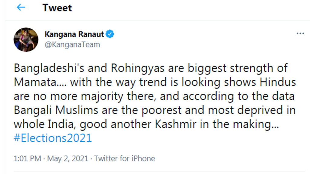 ಈ ಬಗ್ಗೆಯೇ ಟ್ವೀಟ್ ಮಾಡಿರುವ ಕಂಗನಾ, ಬಾಂಗ್ಲಾ ಅಕ್ರಮ ನುಸುಳುಕೋರರು ಹಾಗೂ ರೊಹಿಂಗ್ಯಾಗಳು ದೀದಿಯ ದೊಡ್ಡ ಶಕ್ತಿ ಅಂದಿದ್ದಾರೆ. ಜೊತೆಗೆ ಪಶ್ಚಿಮ ಬಂಗಾಲ ಮತ್ತೊಂದು ಕಾಶ್ಮಿರವಾಗಲಿದೆ ಎಂಬುದನ್ನೂ ಅವರು ಹೇಳಿದ್ದಾರೆ. ನಿನ್ನೆಯಾಗಲೇ ಅಲ್ಲಿ ಗೆದ್ದ ಖುಷಿಯಲ್ಲಿ ಬಿಜೆಪಿ ಕಛೇರಿಗಳಿಗೆ ಬೆಂ’ಕಿ ಹಚ್ಚಿ ಹ’ಲ್ಲೆ ನಡೆಸಿರುವುದು ವರದಿಯಾಗಿದೆ.