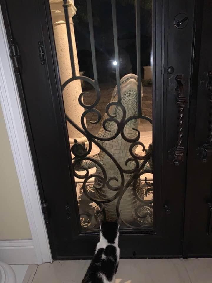 ಈ ಅನಿರೀಕ್ಷಿತ ಘಟನೆಯಿಂದ ಇಡೀ ಕುಟುಂಬದ ಸದಸ್ಯರು ಬಹಳ ಭ ಯ ಭೀ ತ ರಾಗಿದ್ದರೆ, ಅವರ ಮನೆಯಲ್ಲಿ ಅವರು ಸಾಕಿದ್ದ ಬೆಕ್ಕಿಗೆ ಮಾತ್ರ ಅದರ ಯಾವುದೇ ಪರಿವೆಯೂ ಇಲ್ಲದೇ ನಿರ್ಭೀತಿಯಿಂದ ಅದು ಮನೆಯೊಳಗೆ ಮುಚ್ಚಿರುವ ಬಾಗಿಲಿನ ಇನ್ನೊಂದು ಬದಿಯಲ್ಲಿ ಕುಳಿತು ಬಹಳ ಶಾಂತ ಚಿತ್ತವಾಗಿ ಬಾಗಿಲ ಮೇಲೆ ಏರುತ್ತಿರುವ ಮೊಸಳೆಯನ್ನು ಗಮನಿಸುತ್ತಿದೆ. ಬೆಕ್ಕು ಬಲು ಧೈರ್ಯದಿಂದ, ನಿರ್ಭಿತವಾಗಿ ಮೊಸಳೆ ಮೇಲೆರುವುದನ್ನು ಕುಳಿತು ನೀಡುತ್ತಿರುವುದನ್ನು ಕಂಡು ಮನೆಯ ಸದಸ್ಯರು ಆಶ್ಚರ್ಯ ಚಕಿತರಾಗಿದ್ದಾರೆ. ಬೆಕ್ಕಿನ ಆ ವರ್ತನೆ ನೋಡಿ ಅವರೆಲ್ಲಾ ಮೊಸಳೆಯ ಭ ಯ ದ ನಡುವೆಯೇ ಬೆಕ್ಕಿನ ಧೈರ್ಯ ನೋಡಿ ಬೆರಗಾಗಿದ್ದಾರೆ.