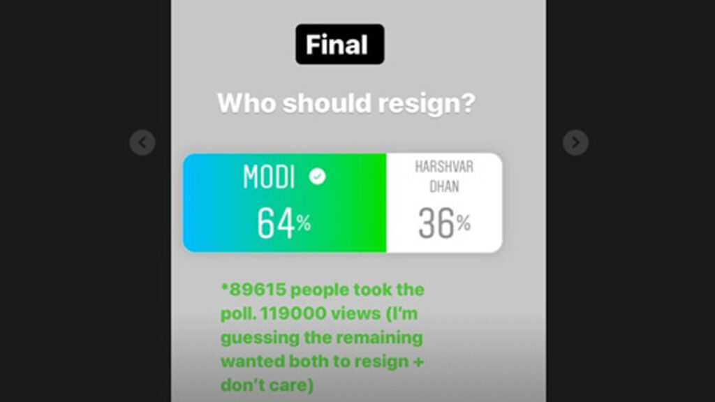 ಇನ್ ಸ್ಟಾಗ್ರಾಂ ನಲ್ಲಿ ಪೋಲ್ ಕ್ರಿಯೇಟ್ ಮಾಡಿರುವ ಅವರು, ಅದರಲ್ಲಿ ಪ್ರಧಾನಿ ಮೋದಿ ರಾಜಿನಾಮೆ ನೀಡಬೇಕಾ ಅಥವಾ ಆರೋಗ್ಯ ಸಚಿವ ಹರ್ಷವರ್ಧನ್ ರಾಜಿನಾಮೆ ನೀಡಬೇಕಾ ಎಂದು ಕೇಳಿದ್ದರು. ಈ ಪೋಲ್ ನಲ್ಲಿ ಸುಮಾರು 90 ಸಾವಿರ ಜನ ಪಾಲ್ಗೊಂಡಿದ್ದು, 64% ಜನ ಮೋದಿ ರಾಜಿನಾಮೆ ಕೊಡಬೇಕು ಎಂದರೆ, 36% ಜನ ಹರ್ಷವರ್ಧನ್ ರಾಜಿನಾಮೆ ನೀಡಬೇಕು ಎಂದಿದ್ದಾರೆ.