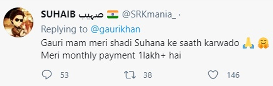 ಹೀಗೆ ಕಾಮೆಂಟ್ ಮಾಡುವಾಗ ಒಬ್ಬ ಟ್ವಿಟರ್ ಬಳಕೆದಾರರು ಮಾಡಿದಂತಹ ಒಂದು ಕಾಮೆಂಟ್ ಎಲ್ಲರನ್ನೂ ಆಶ್ಚರ್ಯಚಕಿತರನ್ನಾಗಿ ಮಾಡಿದೆ. ಟ್ವಿಟರ್ ಬಳಕೆದಾರನೊಬ್ಬ, ಗೌರಿ ಖಾನ್ ಅವರು ಮಾಡಿದ ಪೋಸ್ಟ್ ಗೆ ತನ್ನ ಕಾಮೆಂಟ್ ಮೂಲಕ ಪ್ರತಿಕ್ರಿಯೆ ನೀಡುತ್ತಾ, “ಗೌರಿ ಮೇಡಂ ಸುಹಾನಾ ಖಾನ್ – ನನ್ನ ಮದುವೆಯನ್ನು ಮಾಡಿಸಿ ನನ್ನ ತಿಂಗಳ ಸಂಬಳ ಒಂದು ಲಕ್ಷಕ್ಕಿಂತ ಅಧಿಕವಾಗಿದೆ” ಎಂದು ಹೇಳಿದ್ದಾನೆ.