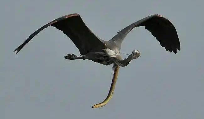 ಹಾವು ಹೆರಾನ್ ನ ಹೊಟ್ಟೆ ಸೀಳಿಕೊಂಡು ಹೊರಗೆ ಬರುತ್ತಿದ್ದರೂ ಕೂಡಾ ಅದು ಇನ್ನೂ ಹಾರುತ್ತಲೇ ಇರುವುದನ್ನು ಫೋಟೋಗ್ರಾಫರ್ ಗಮನಿಸಿದ್ದಾರೆ. ಹೆರಾನ್ ಹೊಟ್ಟೆಯಿಂದ ಹೊರ ಬಂದ ಹಾವು ಈಲ್ ಪ್ರಭೇದಕ್ಕೆ ಸೇರಿದ್ದು ಎನ್ನಲಾಗಿದ್ದು, ಇವು ಸಾಮಾನ್ಯವಾಗಿ ಸಮುದ್ರ ತೀರಗಳಲ್ಲಿ ಹಾಗೂ ಕೆಸರಿನಲ್ಲಿ ಕಂಡು ಬರುತ್ತದೆ ಎನ್ನಲಾಗಿದೆ. ಇವುಗಳ ಬಾಲ ಬಹಳ ಮೊನಚಾಗಿದ್ದು, ಅವು ತಮ್ಮನ್ನು ಯಾವುದಾದರೂ ಜೀವಿ ನುಂಗಿದರೆ ಜೀರ್ಣವಾಗುವ ಮೊನ್ನವೇ ಹೊರಗೆ ಬರಲು ಪ್ರಯತ್ನ ಮಾಡುತ್ತಾ ತಮ್ಮ ಮೊನಚಾದ ಬಾಲವನ್ನು ಬಳಸಿ ಹೊಟ್ಟೆ ಕತ್ತರಿಸಿ ಹೊರಗೆ ಬರಲು ಪ್ರಯತ್ನವನ್ನು ಮಾಡುತ್ತವೆ.