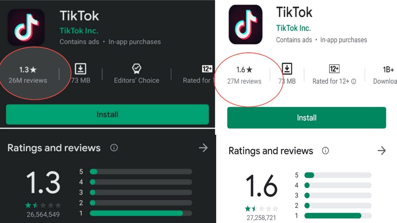 ಸದ್ಯಕ್ಕೆ ಸೋಶಿಯಲ್ ಮಿಡಿಯಾದಲ್ಲಿ ಟಿಕ್ ಟಾಕ್ ವಿರುದ್ಧ ಯುಟ್ಯೂಬ್ ವಾರ್ ದಲ್ಲಿ ಇದೀಗ ಫೇಸ್ ಬುಕ್, ಇನ್ಸ್ಟಾಗ್ರಾಮ್ ಈ ಪ್ಲಾಟ್ ಫಾರ್ಮ್ ದಲ್ಲಿ ಎಕ್ಟಿವ್ ಇದ್ದ ‘ಮೀಮರ್ಸ್’ ಸಹ ಸಹಾಭಾಗಿಯಾಗಿದ್ದಾರೆ. ಇದರಿಂದ ಟಿಕ್ ಟಾಕ್ ಮತ್ತೆ ಹಿಂದೆ ಬೀಳಲು ಕಾರಣವಾಯ್ತು. ಗೂಗಲ್ ಪ್ಲೇ ಸ್ಟೋರ್ ನಲ್ಲಿ 4.5 ರೇಟಿಂಗ್ ನಲ್ಲಿದ್ದ ಈ ಆಪ್ ಕೆಲವೇ ದಿನಗಳಲ್ಲಿ 1.2 ರೇಟಿಂಗ್ ಗೆ ಬಂದು ಮುಗ್ಗರಿಸಿತ್ತು.BanTikTok ಈ ಟ್ರೆಂಡ್ ಜೋರಾಗಿದ್ದಾಗ ಟಿಕ್ ಟಾಕ್ ರೇಟಿಂಗ್ ಇನ್ನು ಕಡಿಮೆಯಾಗುತ್ತೆ ಎನ್ನುವಂತಾಗಿತ್ತು. ಆದರೆ ಆದದ್ದೇ ಬೇರೆ. ಸದ್ಯಕ್ಕೆ ಈಗ 1.6 ರೇಟಿಂಗ್ ನಲ್ಲಿದ್ದು ಇದು ಇನ್ನಷ್ಟು ಹೆಚ್ಚಾಗಿ ಮತ್ತೆ 4* ರೇಟಿಂಗ್ ಸಮೀಪ ಹೋಗುವ ಸಾಧ್ಯತೆಯ ಹಿಂದಿನ ಕಾರಣಗಳೇನು ಎಂಬುದನ್ನು ನೀವೇ ನೋಡಿ.