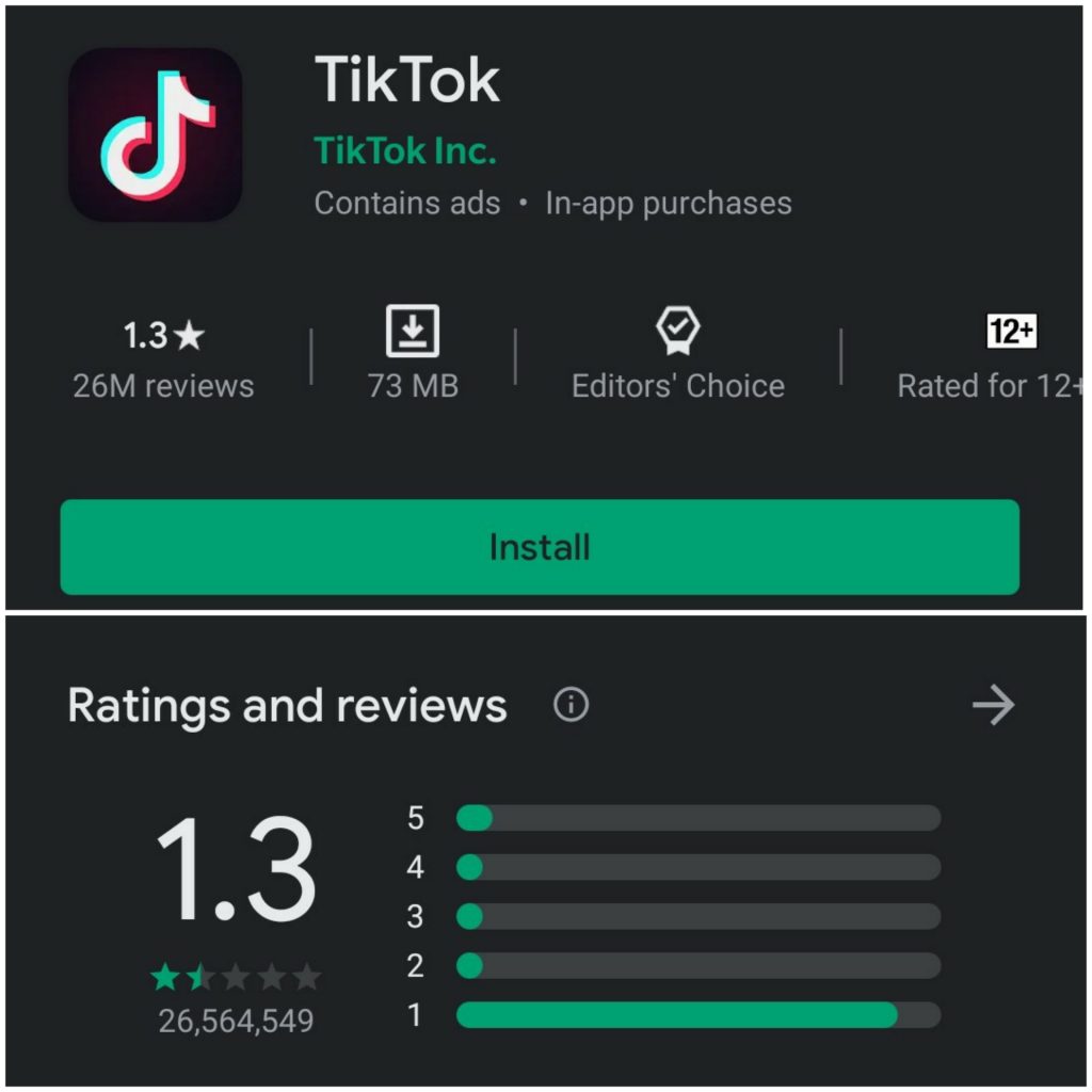 Tik Tok ರೇಟಿಂಗ್ ಹೆಚ್ಚಾಗುವ ಹಿಂದಿನ ಮಹತ್ವದ ಕಾರಣ ಜನರು ಕೊಟ್ಟ 1* ರೇಟಿಂಗ್ ಗೂಗಲ್ ತೆಗೆದು ಹಾಕಿದೆ ಎಂಬ ಸುದ್ದಿ ಇದೆ. ಇನ್ನು ಮುಂದೆಯೂ ಹೀಗೆ ರಿವ್ಯೂವ್ ತೆಗೆದು ಹಾಕುವ ಹಾಗೂ ರೇಟಿಂಗ್ ನಲ್ಲಿ ಸುಧಾರಣೆಯಾದದ್ದು ಕಂಡು ಬರುವ ಸಾಧ್ಯತೆಗಳಿವೆ. App ಗೆ ರಿವ್ಯೂವ್ ನೀಡಿ App ನ್ನು uninstall ಮಾಡಿದಾಗ ಆ ರಿವ್ಯೂವ್ Genuine ಇಲ್ಲ ಅಂತ ಅರ್ಥವಾಗುತ್ತೆ. ಆದ್ದರಿಂದ ಆ ರಿವ್ಯೂವ್ ತೆಗೆದುಹಾಕಲಾಗುತ್ತೆ.
