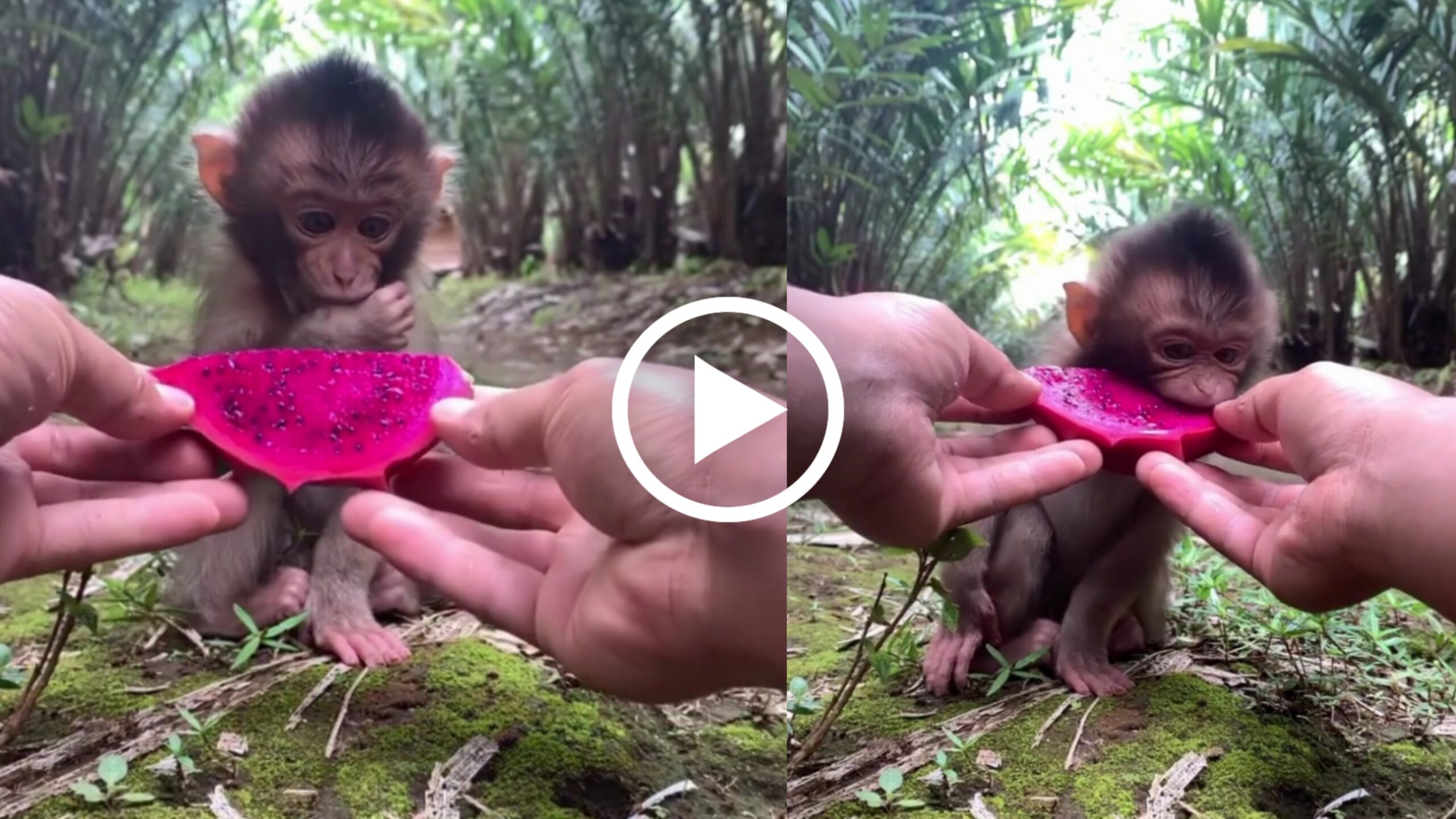 ವಿಡಿಯೋದಲ್ಲಿ ಪುಟ್ಟದಾದ ಮರಿಮಂಗವೊಂದು ಡ್ರ್ಯಾಗನ್ ಫ್ರೂಟ್ ತಿನ್ನುವ ದೃಶ್ಯವಿದೆ. ಈ ದೃಶ್ಯವನ್ನು ಎಲ್ಲಿಯಾದರೂ ಕಾಡಿನಲ್ಲಿ ಶೂಟ್ ಮಾಡಲಾಗಿದೆ. ಮರಿ ಮಂಗವು ನೆಲದ ಮೇಲೆ ಕುಳಿತಿದೆ. ಅದರ ಮುಂದೆ ವ್ಯಕ್ತಿಯು ಡ್ರ್ಯಾಗನ್ ಫ್ರೂಟ್ ಕಟ್ ಮಾಡುವುದನ್ನು ಬಾಯಿಯಲ್ಲಿ ಬೆರಳಿಟ್ಟು ತುಂಬಾ ಆಶ್ಚರ್ಯದಿಂದ ಮಂಗ ವೀಕ್ಷಿಸುತ್ತಿದೆ. ಬಹುಶಃ ಈ ಹಣ್ಣು ಅದು ತಿನ್ನುತ್ತಿರುವದು ಮೊದಲ ಬಾರಿ ಎಂದೆನಿಸುತ್ತಿದೆ.