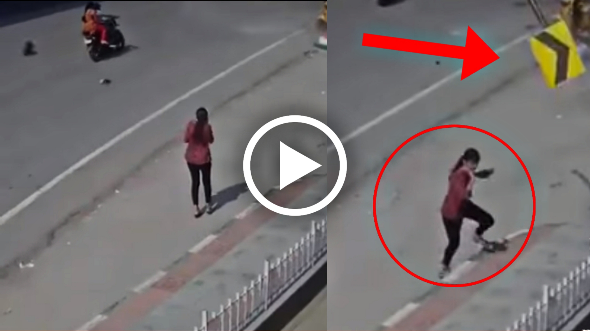 ಈ ವಿಡಿಯೋದಲ್ಲಿ ಯುವತಿಯೊಬ್ಬಳು ರಸ್ತೆಯ ಮೇಲೆ ತನ್ನಷ್ಟಕ್ಕೆ ತಾನು ನಡೆದು ಹೋಗುತ್ತಿದ್ದಾಳೆ. ಅಷ್ಟರಲ್ಲಿ ಏನೋ ಒಂದು ದೊಡ್ಡ ಧಮಾಕ ಆದದ್ದು ಆಕೆಯ ಕಿವಿಗಳಿಗೆ ಕೇಳಿಸುತ್ತದೆ. ಇದನ್ನು ಕೇಳಿದ ಯುವತಿ ಒಮ್ಮೆಲೇ ಬೆಚ್ಚಿಬಿದ್ದು ಅತ್ತಿತ್ತ ನೋಡುತ್ತಾಳೆ. ಆದರೆ ಏನಾಗುತ್ತಿದೆ ಎಂಬುದು ಆಕೆಯ ಗಮನಕ್ಕೆ ಬರುವ ಮುಂಚೆಯೆ ಕಣ್ಣುಗಳ ಮುಂದೆ ಕೆಂಪು ಬಣ್ಣದ ಕಾರೊಂದು ಬದಿಯಲ್ಲಿರುವ ಓವರ್ ಬ್ರಿಜ್ ಮೇಲಿಂದ ಕ್ರ್ಯಾಶ್ ಮಾಡಿ ಆಟಿಗೆ ಸಾಮಾನಿನಂತೆ ಕೆಳಗೆ ಬಿದ್ದು ಚೆಂಡಿನ ಹಾಗೆ ಪುಟಿಗೆ ತಿನ್ನುತ್ತಾ ಮುಂದೆ ಹೋಗುತ್ತದೆ. ಅದರ ನಂತರ ರಸ್ತೆ ಬದಿಗೆ ರೋಡ್ ಗೈಡ್ ಮಾಡಲು ನಿಲ್ಲಿಸಿದ ರೇಡಿಯಮ್ ಸ್ಟಾಂಡ್ ಒಂದು ನೇರ ಯುವತಿಯ ತಲೆಯ ಮೇಲೆ ಬೀಳಲು ಬರುತ್ತದೆ. ಯುವತಿಯು ಅದನ್ನೆಲ್ಲ ವೀಕ್ಷಿಸದೆ ತನ್ನ ಸುತ್ತಮುತ್ತ ಏನೋ ದುರಂತ ಸಂಭವಿಸುತ್ತಿದೆ ಎಂದು ಗಾಬರಿಯಾಗಿ ಏನೂ ತಿಳಿಯದಂತೆ ಎರಡೇ ಎರಡು ಹೆಜ್ಜೆ ಹಿಂದಕ್ಕೆ ಬರುತ್ತಾಳೆ. ಅಷ್ಟರಲ್ಲಿ ಕಬ್ಬಿಣದ ರೇಡಿಯಮ್ ಸ್ಟಾಂಡ್ ಆಕೆ ಮೊದಲ ನಿಂತ ಸ್ಥಳದಲ್ಲಿಯೇ ಬಂದು ಬೀಳುತ್ತದೆ. ಯುವತಿ ಸಂಪೂರ್ಣವಾಗಿ ತಬ್ಬಿಬ್ಬಾಗಿರುವುದನ್ನು ಇಲ್ಲಿ ಗಮನಿಸಬಹುದು. ಒಟ್ಟಿನಲ್ಲಿ ಕೂದಲೆಳೆಯ ಅಂತರದಲ್ಲಿ ಯುವತಿಯು ಅಪಘಾತದಿಂದ ಅದೃಷ್ಟವಶಾತ್ ಪಾರಾಗಿದ್ದನ್ನು ಇಲ್ಲಿ ನೋಡಬಹುದು.