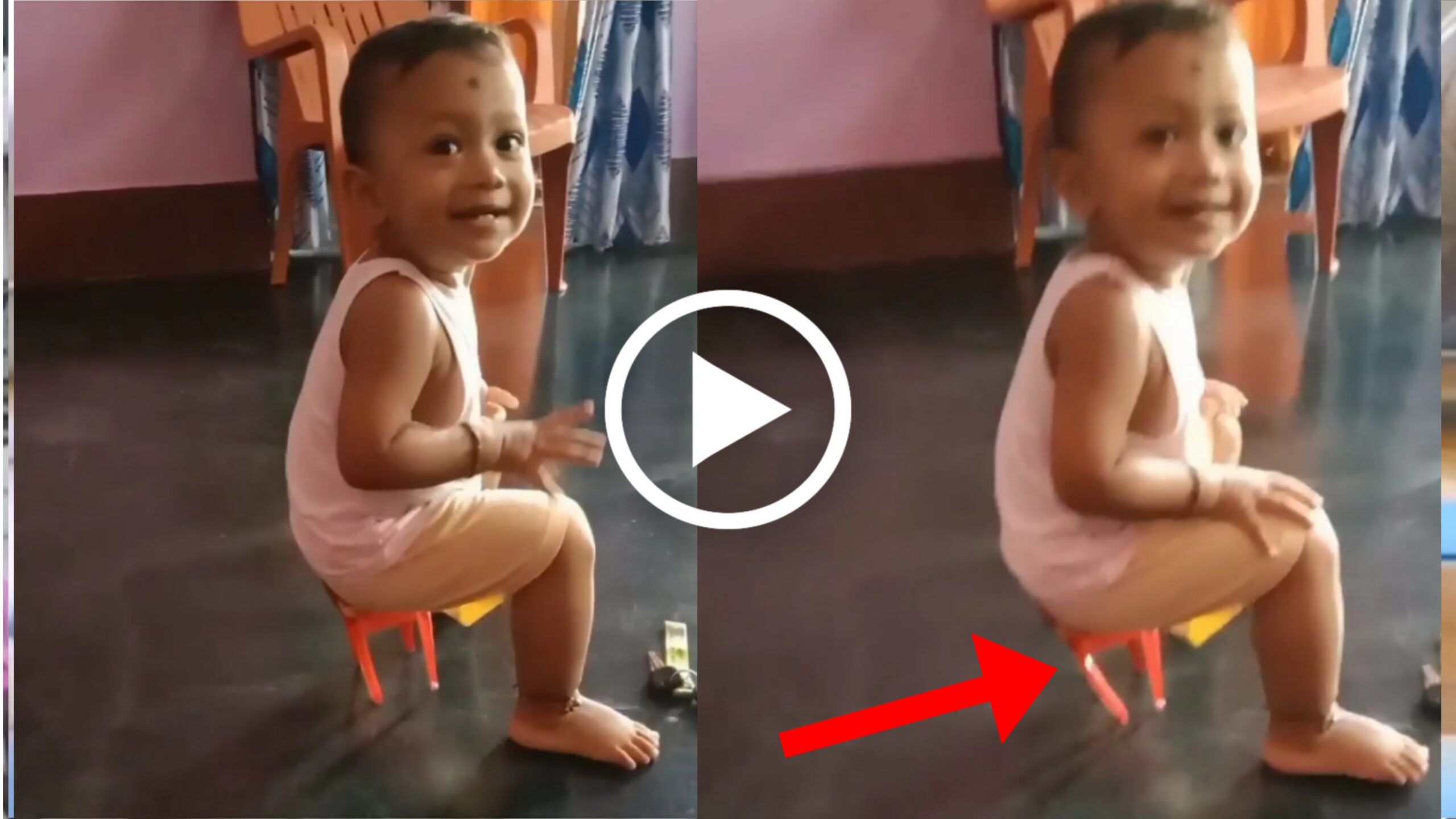 ಪ್ರಸ್ತುತ ವೀಡಿಯೋದಲ್ಲಿ ಒಬ್ಬ ಪುಟ್ಟ ಬಾಲಕ ತನ್ನ ಆಟದ ಖುರ್ಚಿಯನ್ನು ತಗೆದುಕೊಂಡು ಅದರ ಜೊತೆಗೆ ಆಟ ಆಡುತ್ತಿರುತ್ತಾನೆ. ಆಗ ಅದನ್ನು ತನ್ನ ತಾಯಿ ರೆಕಾರ್ಡ್ ಮಾಡುತ್ತಿರುತ್ತಾಳೆ. ಹಾಗೆ ತಾಯಿ ಹುಡುಗನಿಗೆ ಆ ಆಟಿಕೆಯ ಖುರ್ಚಿಯ ಮೇಲೆ ಕುಳಿತುಕೊಳ್ಳಲು ಹೇಳುತ್ತಾಳೆ. ಮಗು ಸಹ ತುಂಬಾನೇ ಜಾಣ ನಾಗಿರುತ್ತಾನೆ . ಸಾವಕಾಶವಾಗಿ ಖುರ್ಚಿಯ ಮುಂದೆ ಹೋಗಿ ಅದರ ಮೇಲೆ ಕುಳಿತುಕೊಳ್ಳುತ್ತಾನೆ. ಕುಳಿತ ಕೆಲವು ಸೆಕೆಂಡ್ ಗಳ ನಂತರ ಪ್ಲ್ಯಾಸ್ಟಿಕ್ ಆಟಿಕೆ ಆ ಬಾಲಕನ ಭಾರ ತಾಳಿಕೊಳ್ಳಲು ಆಗದೆ ಅದು ಮಡಚಿ ನೆಲಕ್ಕೆ ಉರುಳುತ್ತದೆ. ಆಗ ಏನು ಆಧಾರ ವಿಲ್ಲದೆ ಧೈರ್ಯದಿಂದ ಕುಳಿತಿದ್ದ ಬಾಲಕ ಸಹ ಆಯತಪ್ಪಿ ಜೋರಾಗಿ ನೆಲಕ್ಕೆ ಬೀಳುತ್ತಾನೆ. ಇದೆಲ್ಲ ದೃಶ್ಯವನ್ನು ತನ್ನ ತಾಯಿ ರೆಕಾರ್ಡ್ ಮಾಡುತ್ತಿರುತ್ತಾಳೆ. ತದನಂತರ ಅದನ್ನು ಸೋಶಿಯಲ್ ಮಿಡಿಯಾದಲ್ಲಿ ಶೇರ್ ಮಾಡಿದ್ದಾಳೆ.