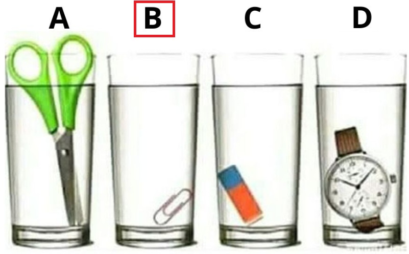 ಇಲ್ಲಿ ಕಾಣುತ್ತಿರುವ ಚಿತ್ರದಲ್ಲಿ ನೀರು ತುಂಬಿದ 4 ಗ್ಲಾಸ್ ಗಳಿವೆ. ಈ ನಾಲ್ಕು ಗ್ಲಾಸ್ ಗಳನ್ನು ತುಂಬಾ ಸರಿಯಾಗಿ ಒಮ್ಮೆ ನೋಡಿಕೊಳ್ಳಿ. ಮತ್ತು 20 ಸೆಕೆಂಡುಗಳಲ್ಲಿ ಈ ಒಗಟನ್ನು ಬಗೆಹರಿಸಲು ಪ್ರಯತ್ನಿಸಿ. ಗ್ಲಾಸ್ ಗಳಲ್ಲಿ ಇರಿಸಲಾದ ಪ್ರತಿಯೊಂದು ವಸ್ತುಗಳ ಬಗ್ಗೆ ಸರಿಯಾಗಿ ವಿಚಾರ ಮಾಡಿ. ಒಂದು ಗ್ಲಾಸ್ ನಲ್ಲಿ ಕತ್ತರಿ ಇದೆ, ಇನ್ನೊಂದರಲ್ಲಿ ಪೇಪರ್ ಕ್ಲಿಪ್ ಇದೆ, ಮೂರನೇ ಗ್ಲಾಸ್ ನಲ್ಲಿ ರಬರ್ ಅಥವಾ ಇರೆಸರ್ ಇದೆ, ಹಾಗೂ ನಾಲ್ಕನೇ ಗ್ಲಾಸ್ ನಲ್ಲಿ ಒಂದು ವಾಚ್ ಇದೆ. ಪ್ರತಿಯೊಂದು ಗ್ಲಾಸ್ ನಲ್ಲಿ ಬೇರೆ ಬೇರೆ ವಸ್ತುಗಳು ಕಂಡು ಬರುತ್ತಿದ್ದರೂ ನೀರಿನ ಮಟ್ಟ ಮಾತ್ರ ಎಲ್ಲ ಗ್ಲಾಸ್ ಗಳಲ್ಲಿ ಸಮನಾಗಿ ಕಂಡುಬರುತ್ತಿದೆ. ಯಾವ ಗ್ಲಾಸ್ ನಲ್ಲಿ ನೀರು ಹೆಚ್ಚಿದೆ ಎಂಬುದನ್ನು ಕಂಡುಹಿಡಿಯಬೇಕಾಗಿದೆ.